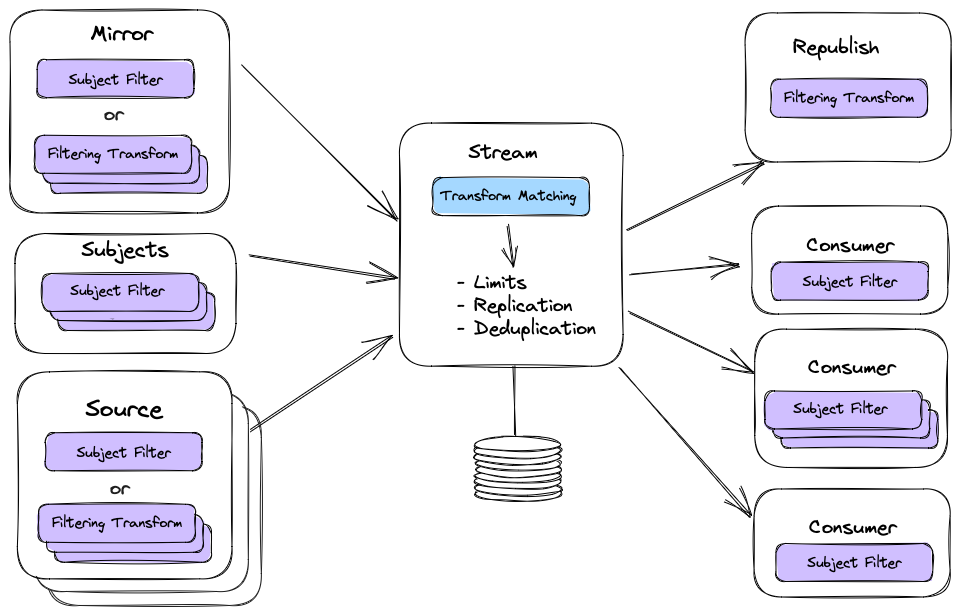 转换在消息一进入定义了转换的作用域(集群、账户、叶子节点、流)时就会立即应用,无论消息是如何到达的(客户端发布、通过网关、流导入、流 source/mirror)。这发生在应用任何路由或订阅兴趣之前。在任何情况下,消息都将看起来像是从转换后的主题发布的。
